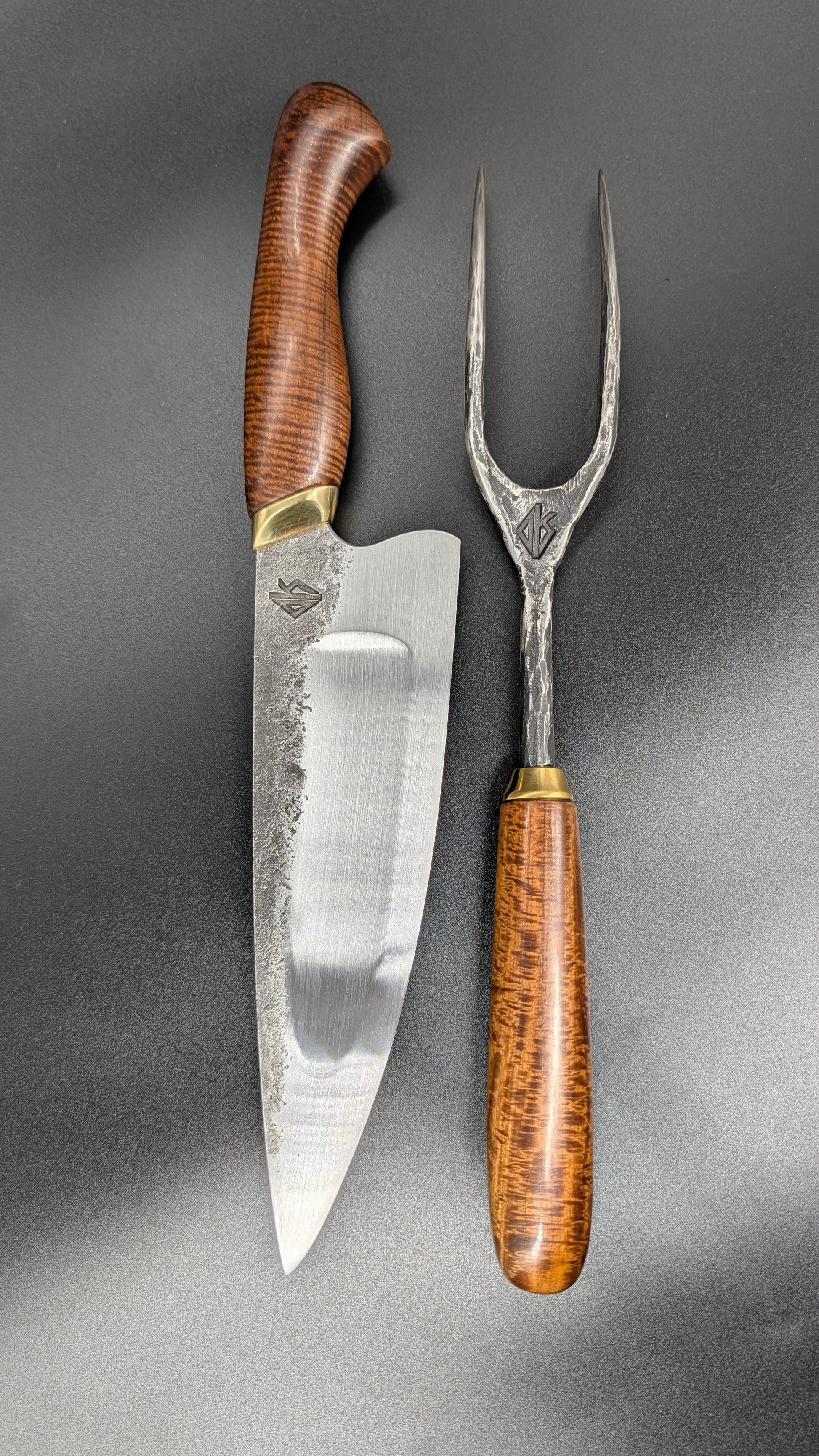 Forged Carbon steel chef knife and stainless steel carving fork